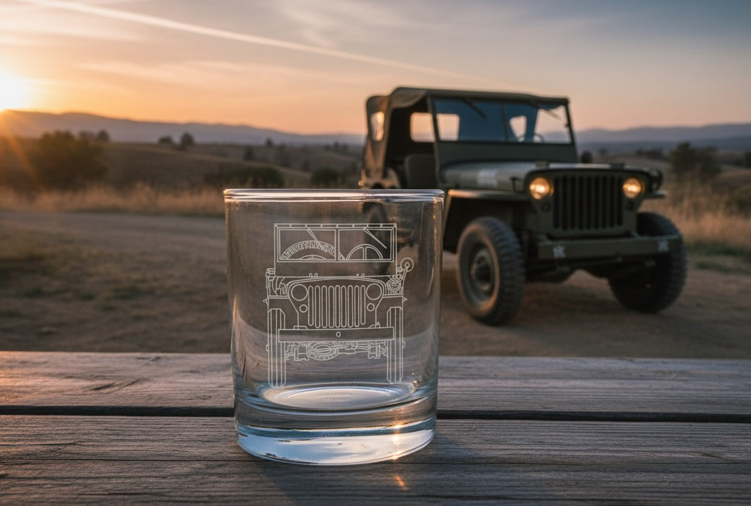 The Iconic Jeep. Rugged, simple, and endlessly reliable. The Willys MB Jeep Engraved Whiskey Glass is a tribute to this timeless workhorse.
